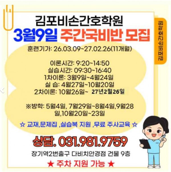 김포 비손간호학원에서 26년 3월 9일 주간 국비반을 개강합니다. 비손간호학원 26-01-15 10:17 26 0 http://#김포한강신도시 #김포간호학원 #비손간호학원 #장기동간호학원 #장기동 #김포시간호학원 #검단비손간호학원 #간호학원… [11] 김포한강 신도시 최고의 간호학원인 김포비손간호학원에서 2026년 3월 9일 주간 국비반을 개강합니다. 일반반 학생도 모집합니다. 댓글목록 등록된 댓글이 없습니다. 이전 목록 다음